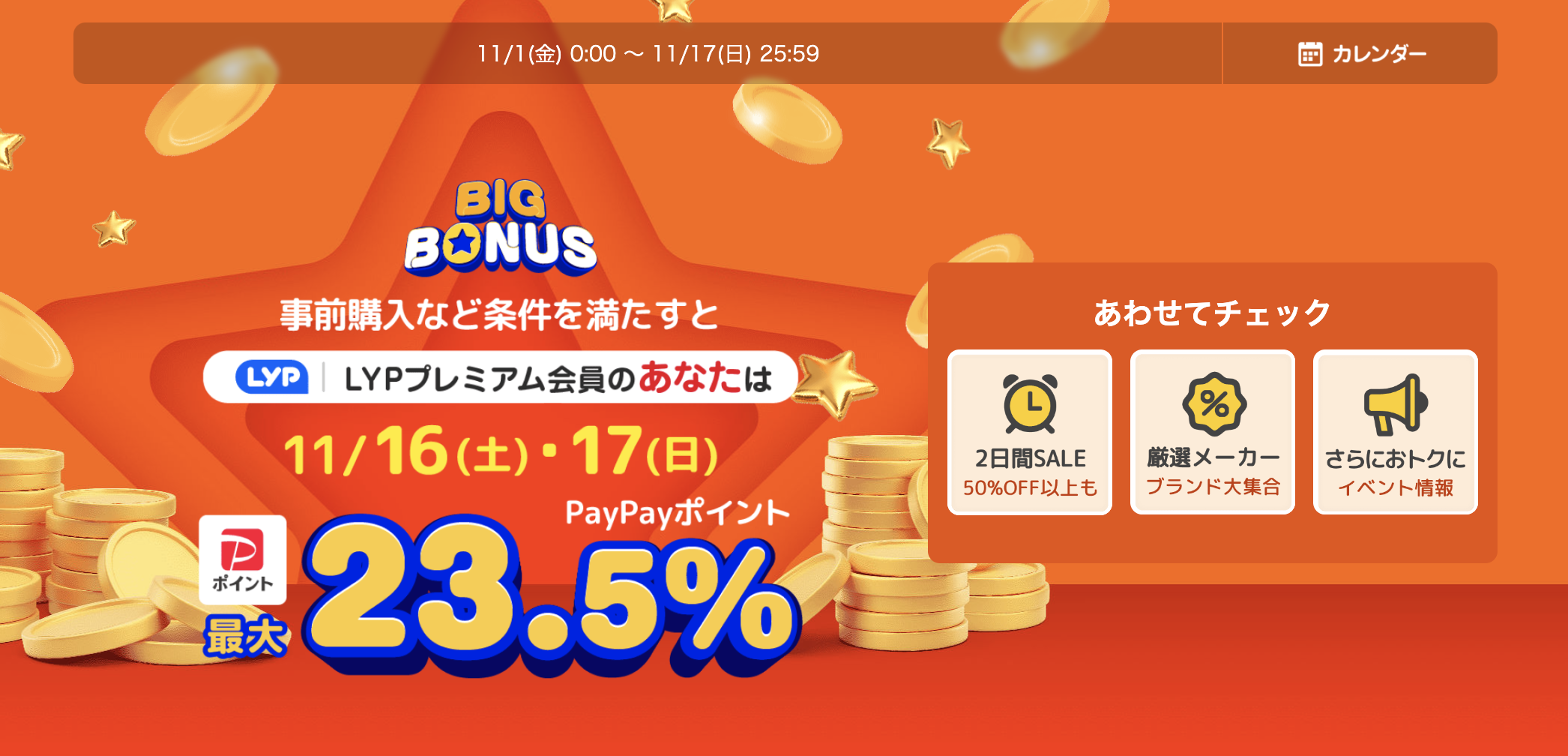 12/1~ 大型キャンペーン 最大23.5%付与・2月~ 大型企画 最大27.5%付与 お得なクーポン・抽選・セール(最大70%OFF)など https://shopping.yahoo.co.jp/promotion/sale/bigbonus/